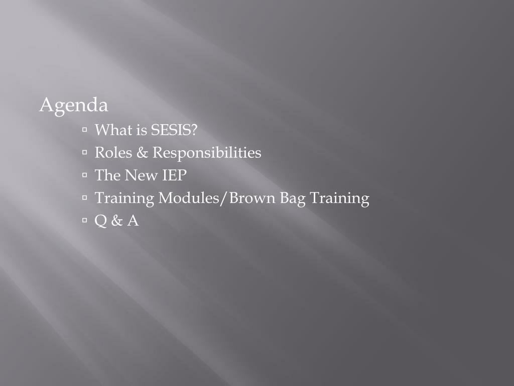 The Special Education Student Information System. Agenda What is SESIS? Roles & Responsibilities The New IEP Training Modules/Brown Bag Training Q & A . What is SESIS? .