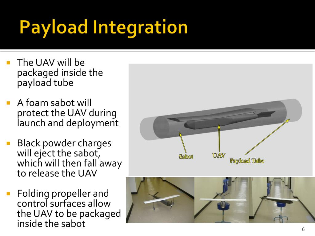 Payload Integration • The UAV will be packaged inside the payload tube • A foam sabot will protect the UAV during launch and deployment • Black powder charges will eject the sabot, which will then fall away to release the UAV • Folding propeller and control surfaces allow the UAV to be packaged inside the sabot