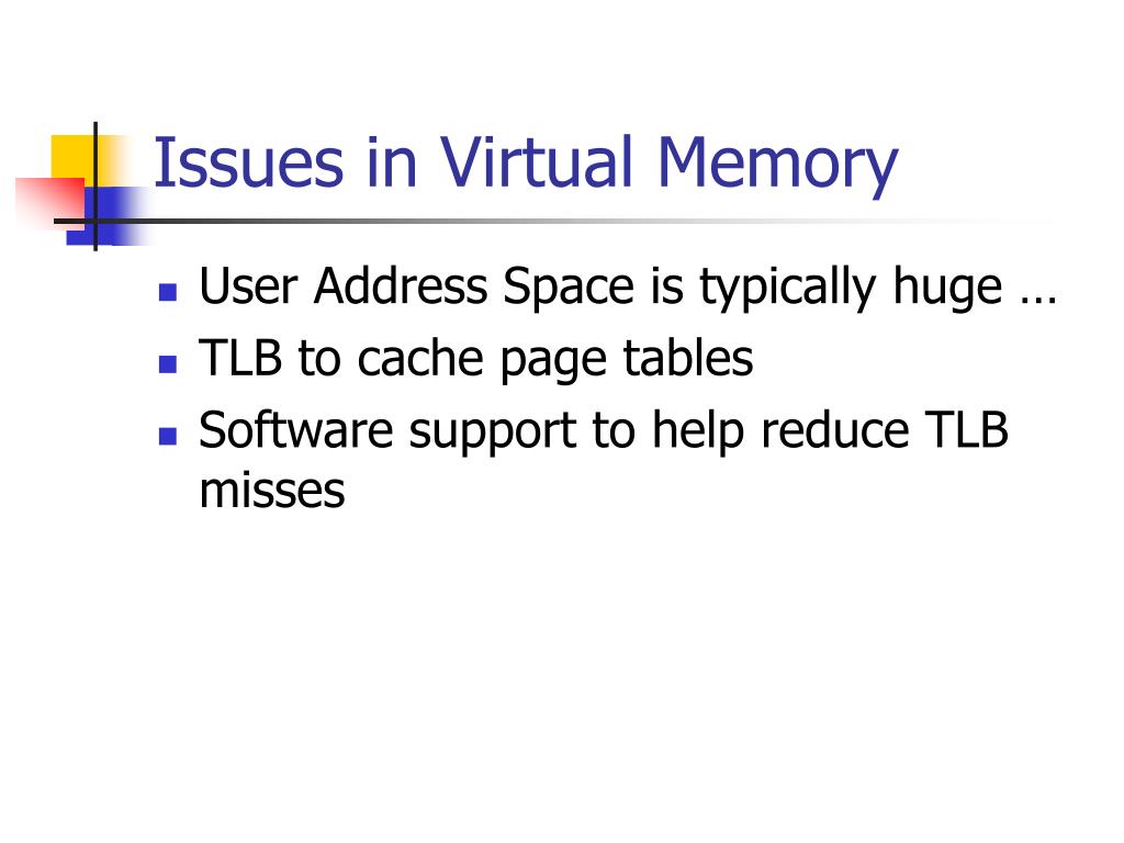 Issues in Virtual Memory • User Address Space is typically huge … • TLB to cache page tables • Software support to help reduce TLB misses