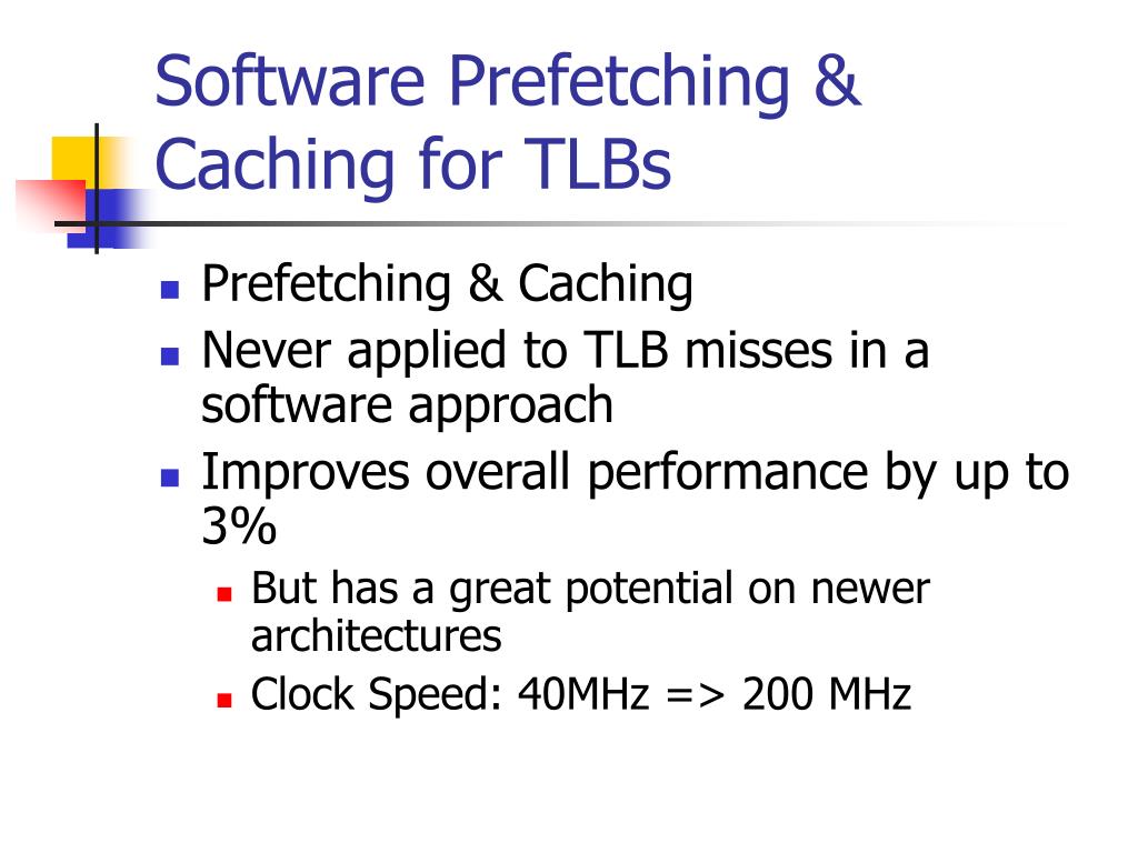 Software Prefetching & Caching for TLBs • Prefetching & Caching • Never applied to TLB misses in a software approach • Improves overall performance by up to 3% • But has a great potential on newer architectures • Clock Speed: 40MHz => 200 MHz