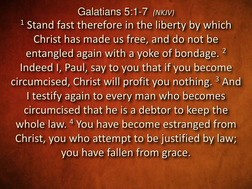 Galatians 5:1-7 (NKJV) 1 Stand fast therefore in the liberty by which Christ has made us free, and do not be entangled again with a yoke of bondage. 2 Indeed I, Paul, say to you that if you become circumcised, Christ will profit you nothing. 3 And I testify again to every man who becomes circumcised that he is a debtor to keep the whole law. 4 You have become estranged from Christ, you who attempt to be justified by law; you have fallen from grace.