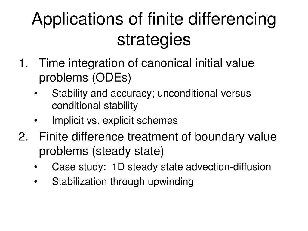Applications of finite differencing strategies • Time integration of canonical initial value problems (ODEs) • Stability and accuracy; unconditional versus conditional stability • Implicit vs. explicit schemes • Finite difference treatment of boundary value problems (steady state) • Case study: 1D steady state advection-diffusion • Stabilization through upwinding