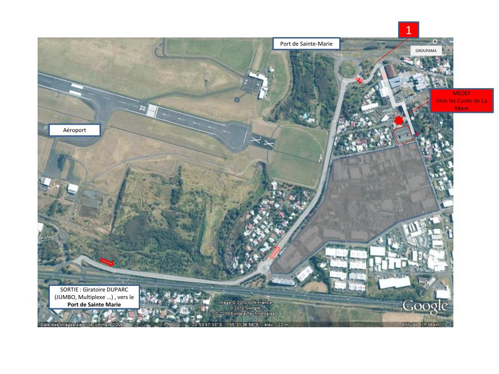 1. Port de Sainte-Marie. GROUPAMA. MEDEF Imm les Cuves de La Mare. Aéroport. Parkings. SORTIE : Giratoire DUPARC (JUMBO, Multiplexe …) , vers le Port de Sainte Marie. MEDEF Réunion 30 rue André Lardy – Bat B. Port de Sainte Marie.