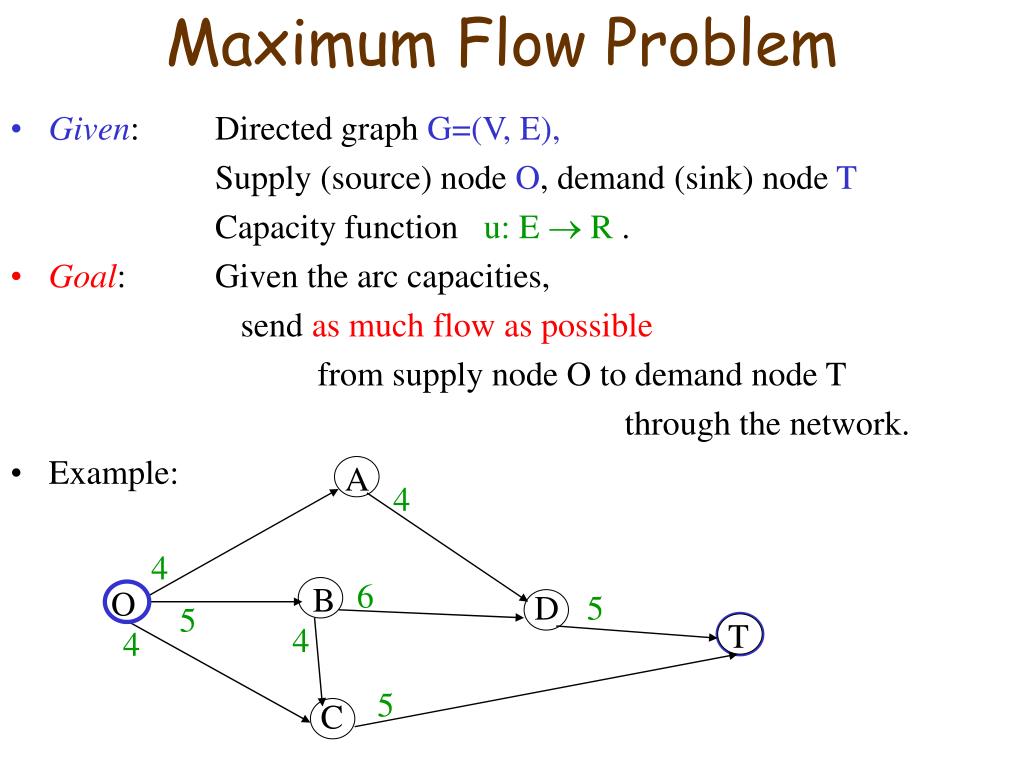 A 4 4 6 B O D 5 5 T 4 4 5 C Maximum Flow Problem • Given: Directed graph G=(V, E), Supply (source) node O,demand (sink) node T Capacity function u: E R . • Goal: Given the arc capacities, send as much flow as possible from supply node O to demand node T through the network. • Example: