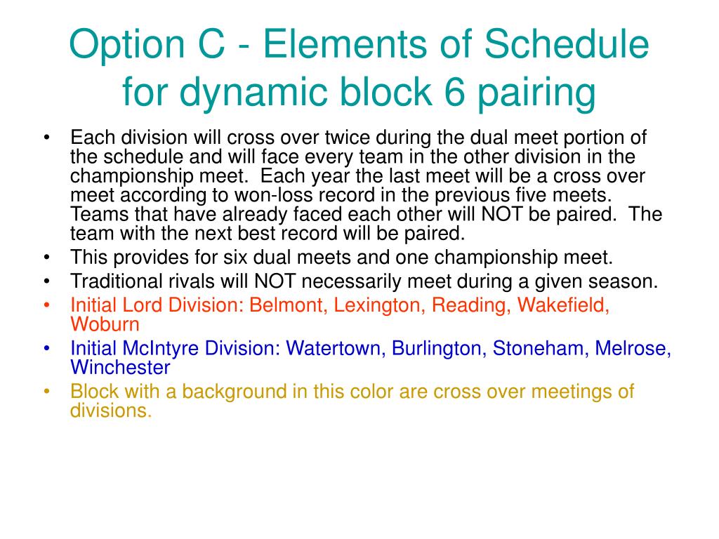 Option C - Elements of Schedule for dynamic block 6 pairing • Each division will cross over twice during the dual meet portion of the schedule and will face every team in the other division in the championship meet. Each year the last meet will be a cross over meet according to won-loss record in the previous five meets. Teams that have already faced each other will NOT be paired. The team with the next best record will be paired. • This provides for six dual meets and one championship meet. • Traditional rivals will NOT necessarily meet during a given season. • Initial Lord Division: Belmont, Lexington, Reading, Wakefield, Woburn • Initial McIntyre Division: Watertown, Burlington, Stoneham, Melrose, Winchester • Block with a background in this color are cross over meetings of divisions.