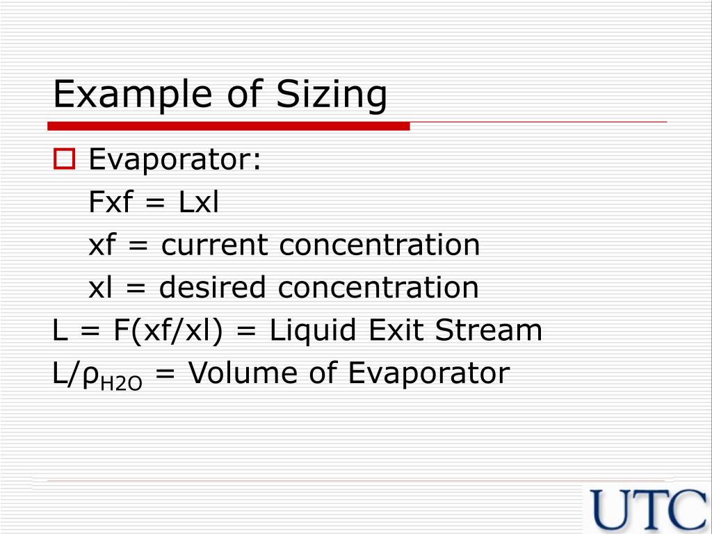 Example of Sizing • Evaporator: Fxf = Lxl xf = current concentration xl = desired concentration L = F(xf/xl) = Liquid Exit Stream L/ρH2O = Volume of Evaporator