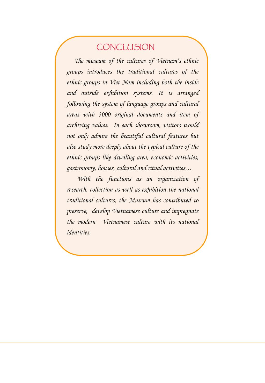 CONCLUSION The museum of the cultures of Vietnam’s ethnic groups introduces the traditional cultures of the ethnic groups in Viet Nam including both the inside and outside exhibition systems. It is arranged following the system of language groups and cultural areas with 3000 original documents and item of archiving values. In each showroom, visitors would not only admire the beautiful cultural features but also study more deeply about the typical culture of the ethnic groups like dwelling area, economic activities, gastronomy, houses, cultural and ritual activities… With the functions as an organization of research, collection as well as exhibition the national traditional cultures, the Museum has contributed to preserve, develop Vietnamese culture and impregnate the modern Vietnamese culture with its national identities.