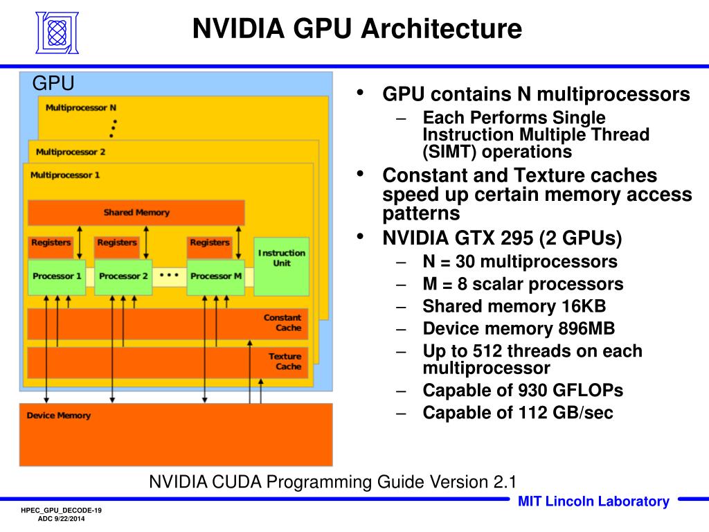 NVIDIA GPU Architecture GPU • GPU contains N multiprocessors • Each Performs Single Instruction Multiple Thread (SIMT) operations • Constant and Texture caches speed up certain memory access patterns • NVIDIA GTX 295 (2 GPUs) • N = 30 multiprocessors • M = 8 scalar processors • Shared memory 16KB • Device memory 896MB • Up to 512 threads on each multiprocessor • Capable of 930 GFLOPs • Capable of 112 GB/sec NVIDIA CUDA Programming Guide Version 2.1