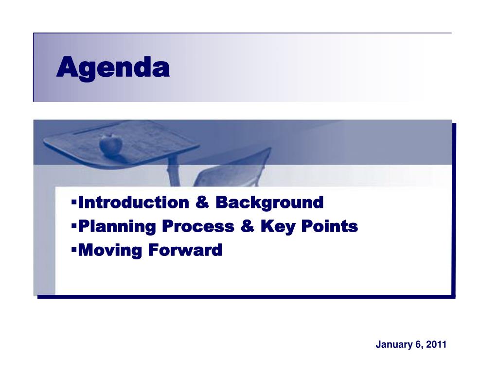 Introduction & Background Planning Process & Key Points Moving Forward Agenda