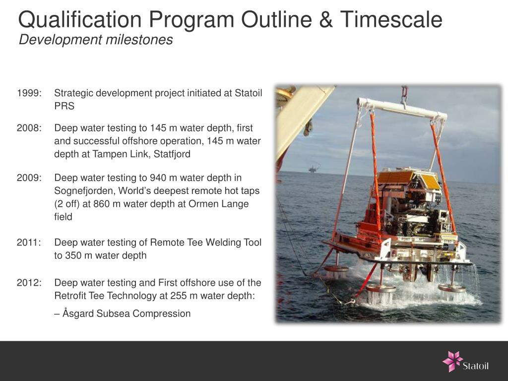Statoil Strategy - Remote hot tap technologyStatoil PRS Pool - Haugesund - Norway • Emergency preparedness Pool for subsea pipelines • Founded in 1987 • First Diver assisted Hot-tap in 1997 • First Pre-installed Hot-tap tees installed with Statoil operated pipelines mid 1990’s • Initiated Remote Hot-tap development in 1999 • Phase 1: Remote cutting system • Phase 2: Retrofit Tee technology