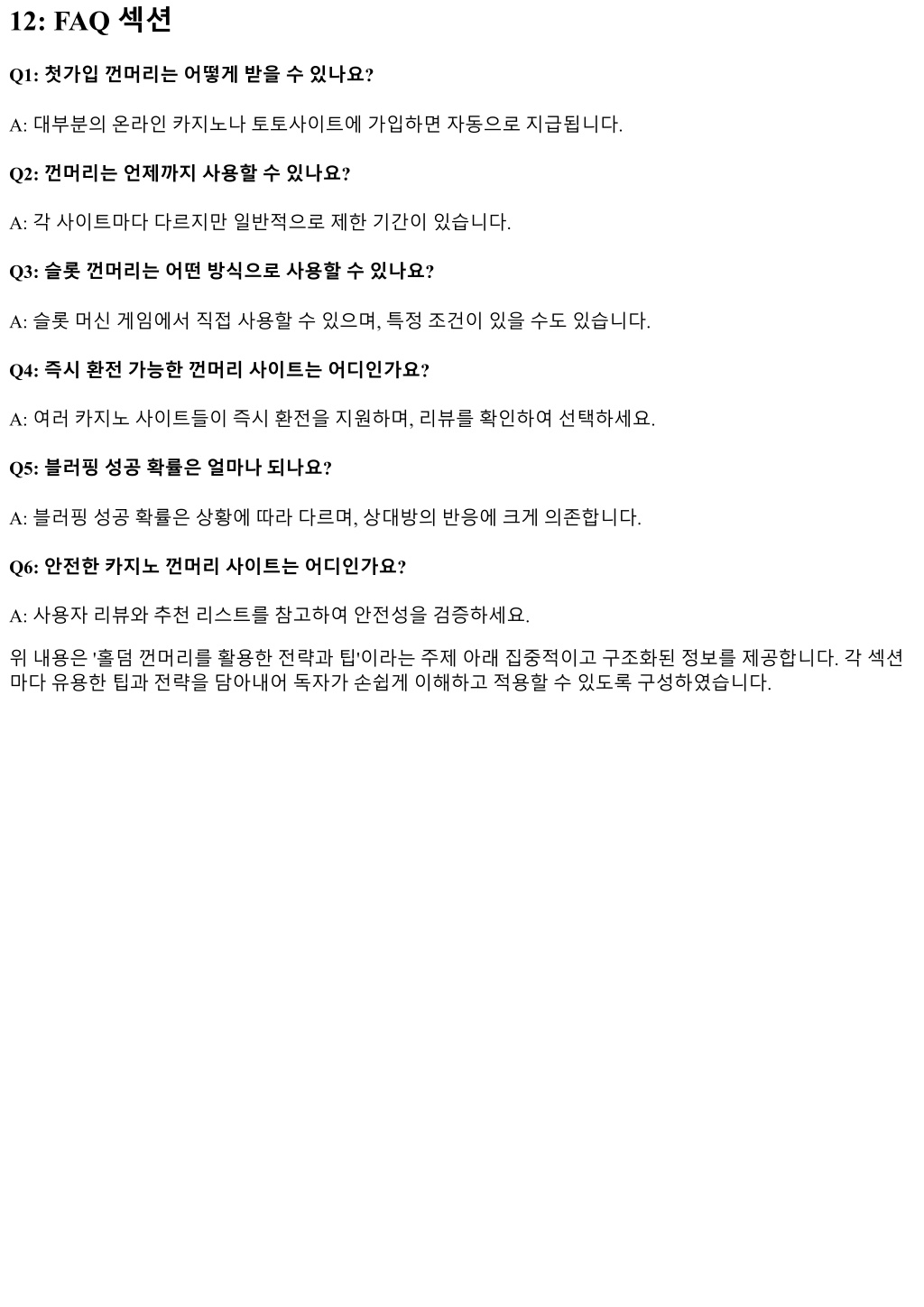 12: FAQ 섹션 Q1: 첫가입껀머리는어떻게받을수있나요? A: 대부분의온라인카지노나토토사이트에가입하면자동으로지급됩니다. Q2: 껀머리는언제까지사용할수있나요? A: 각사이트마다다르지만일반적으로제한기간이있습니다. Q3: 슬롯껀머리는어떤방식으로사용할수있나요? A: 슬롯머신게임에서직접사용할수있으며, 특정조건이있을수도있습니다. Q4: 즉시환전가능한껀머리사이트는어디인가요? A: 여러카지노사이트들이즉시환전을지원하며, 리뷰를확인하여선택하세요. Q5: 블러핑성공확률은얼마나되나요? A: 블러핑성공확률은상황에따라다르며, 상대방의반응에크게의존합니다. Q6: 안전한카지노껀머리사이트는어디인가요? A: 사용자리뷰와추천리스트를참고하여안전성을검증하세요. 위내용은 '홀덤껀머리를활용한전략과팁'이라는주제아래집중적이고구조화된정보를제공합니다. 각섹션 마다유용한팁과전략을담아내어독자가손쉽게이해하고적용할수있도록구성하였습니다.