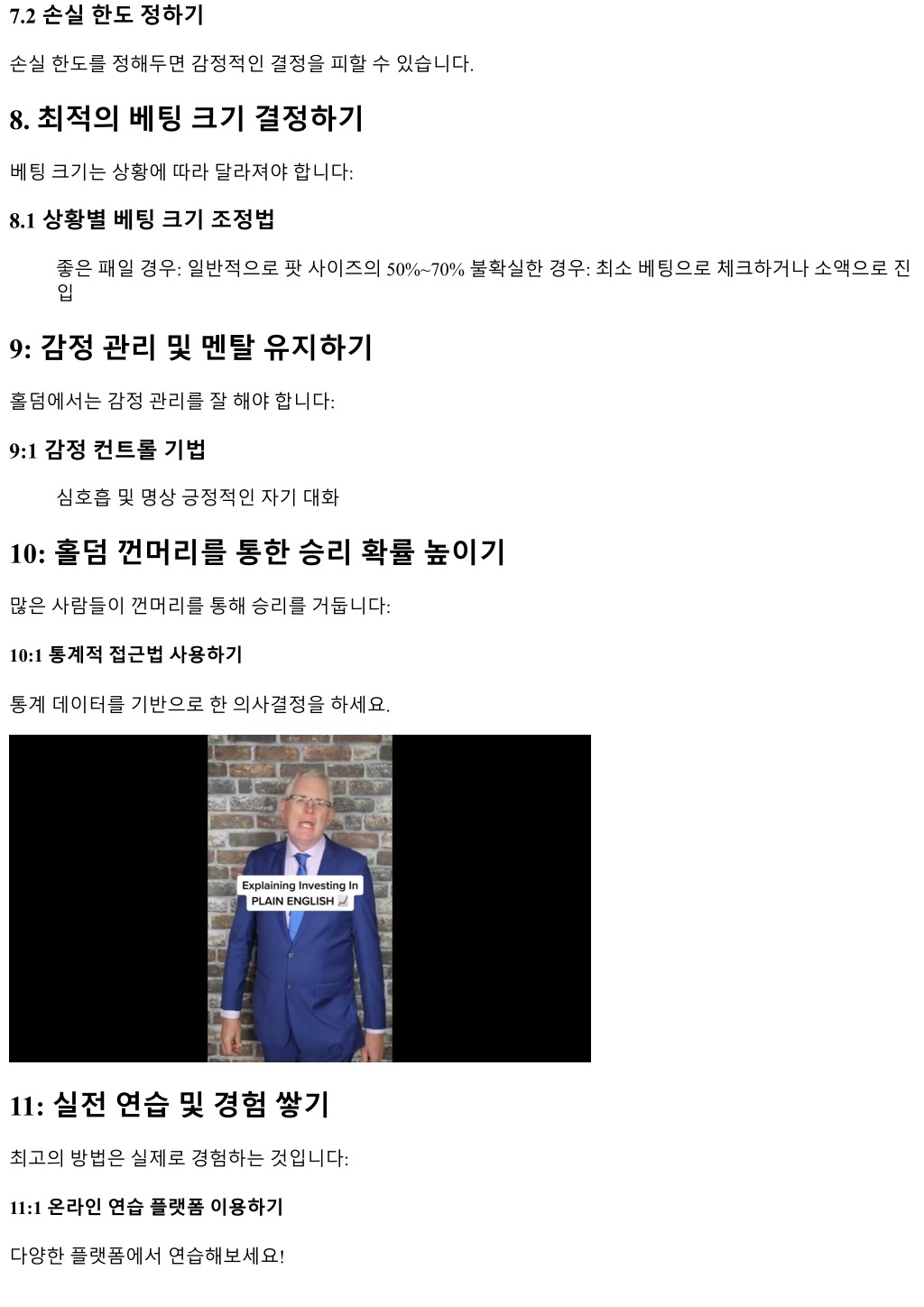 7.2 손실한도정하기 손실한도를정해두면감정적인결정을피할수있습니다. 8. 최적의베팅크기결정하기 베팅크기는상황에따라달라져야합니다: 8.1 상황별베팅크기조정법 좋은패일경우: 일반적으로팟사이즈의 50%~70% 불확실한경우: 최소베팅으로체크하거나소액으로진 입 9: 감정관리및멘탈유지하기 홀덤에서는감정관리를잘해야합니다: 9:1 감정컨트롤기법 심호흡및명상긍정적인자기대화 10: 홀덤껀머리를통한승리확률높이기 많은사람들이껀머리를통해승리를거둡니다: 10:1 통계적접근법사용하기 통계데이터를기반으로한의사결정을하세요. 11: 실전연습및경험쌓기 최고의방법은실제로경험하는것입니다: 11:1 온라인연습플랫폼이용하기 다양한플랫폼에서연습해보세요!