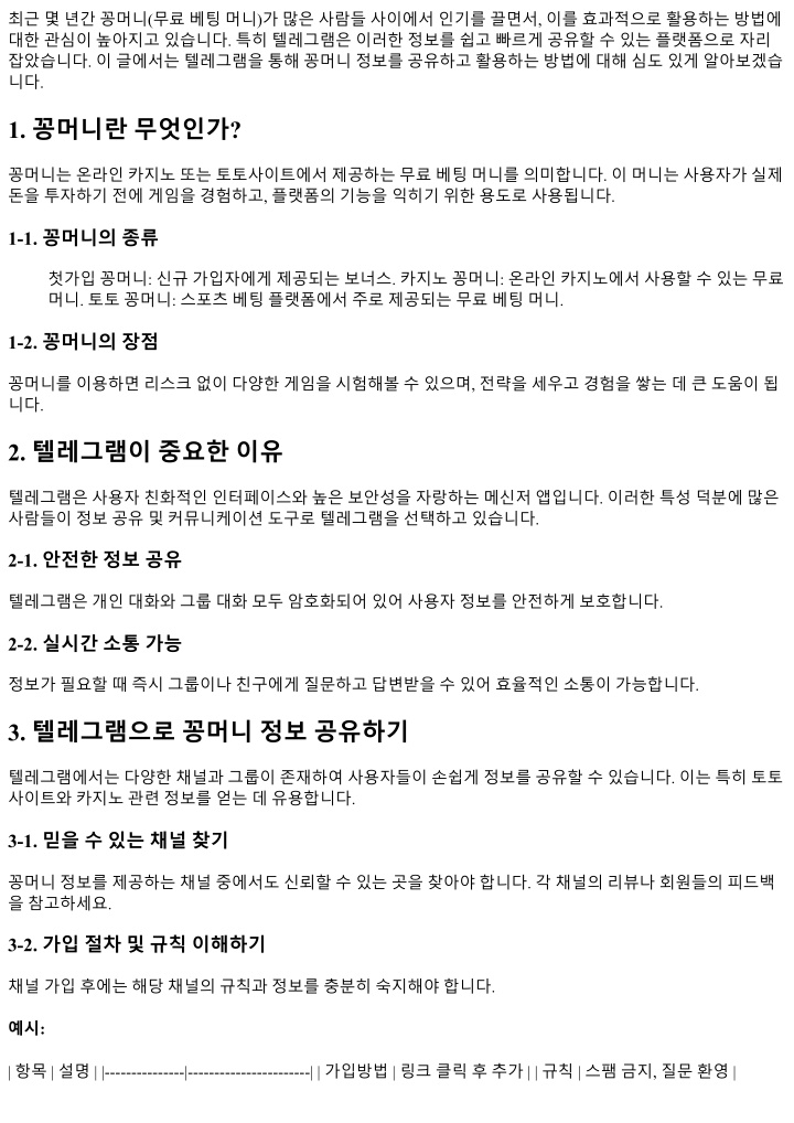 최근몇년간꽁머니(무료베팅머니)가많은사람들사이에서인기를끌면서, 이를효과적으로활용하는방법에 대한관심이높아지고있습니다. 특히텔레그램은이러한정보를쉽고빠르게공유할수있는플랫폼으로자리 잡았습니다. 이글에서는텔레그램을통해꽁머니정보를공유하고활용하는방법에대해심도있게알아보겠습 니다. 1. 꽁머니란무엇인가? 꽁머니는온라인카지노또는토토사이트에서제공하는무료베팅머니를의미합니다. 이머니는사용자가실제 돈을투자하기전에게임을경험하고, 플랫폼의기능을익히기위한용도로사용됩니다. 1-1. 꽁머니의종류 첫가입꽁머니: 신규가입자에게제공되는보너스. 카지노꽁머니: 온라인카지노에서사용할수있는무료 머니. 토토꽁머니: 스포츠베팅플랫폼에서주로제공되는무료베팅머니. 1-2. 꽁머니의장점 꽁머니를이용하면리스크없이다양한게임을시험해볼수있으며, 전략을세우고경험을쌓는데큰도움이됩 니다. 2. 텔레그램이중요한이유 텔레그램은사용자친화적인인터페이스와높은보안성을자랑하는메신저앱입니다. 이러한특성덕분에많은 사람들이정보공유및커뮤니케이션도구로텔레그램을선택하고있습니다. 2-1. 안전한정보공유 텔레그램은개인대화와그룹대화모두암호화되어있어사용자정보를안전하게보호합니다. 2-2. 실시간소통가능 정보가필요할때즉시그룹이나친구에게질문하고답변받을수있어효율적인소통이가능합니다. 3. 텔레그램으로꽁머니정보공유하기 텔레그램에서는다양한채널과그룹이존재하여사용자들이손쉽게정보를공유할수있습니다. 이는특히토토 사이트와카지노관련정보를얻는데유용합니다. 3-1. 믿을수있는채널찾기 꽁머니정보를제공하는채널중에서도신뢰할수있는곳을찾아야합니다. 각채널의리뷰나회원들의피드백 을참고하세요. 3-2. 가입절차및규칙이해하기 채널가입후에는해당채널의규칙과정보를충분히숙지해야합니다. 예시: | 항목 | 설명 | |---------------|-----------------------| | 가입방법 | 링크클릭후추가 | | 규칙 | 스팸금지, 질문환영 |