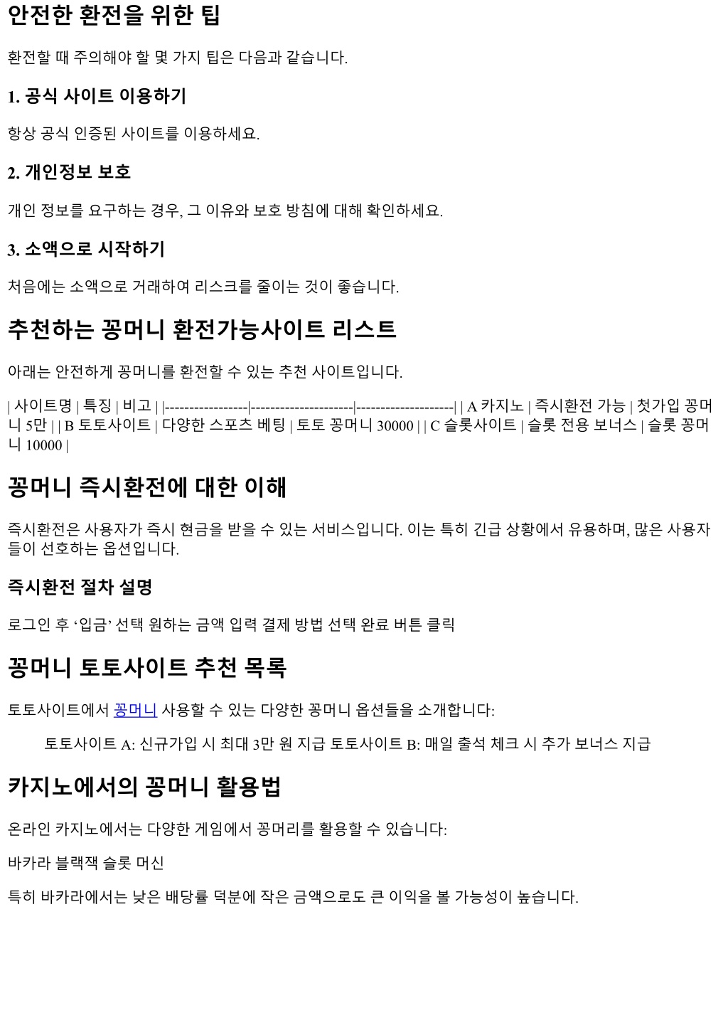 안전한환전을위한팁 환전할때주의해야할몇가지팁은다음과같습니다. 1. 공식사이트이용하기 항상공식인증된사이트를이용하세요. 2. 개인정보보호 개인정보를요구하는경우, 그이유와보호방침에대해확인하세요. 3. 소액으로시작하기 처음에는소액으로거래하여리스크를줄이는것이좋습니다. 추천하는꽁머니환전가능사이트리스트 아래는안전하게꽁머니를환전할수있는추천사이트입니다. | 사이트명 | 특징 | 비고 | |-----------------|---------------------|--------------------| | A 카지노 | 즉시환전가능 | 첫가입꽁머 니 5만 | | B 토토사이트 | 다양한스포츠베팅 | 토토꽁머니 30000 | | C 슬롯사이트 | 슬롯전용보너스 | 슬롯꽁머 니 10000 | 꽁머니즉시환전에대한이해 즉시환전은사용자가즉시현금을받을수있는서비스입니다. 이는특히긴급상황에서유용하며, 많은사용자 들이선호하는옵션입니다. 즉시환전절차설명 로그인후 ‘입금’ 선택원하는금액입력결제방법선택완료버튼클릭 꽁머니토토사이트추천목록 토토사이트에서꽁머니사용할수있는다양한꽁머니옵션들을소개합니다: 토토사이트 A: 신규가입시최대 3만원지급토토사이트 B: 매일출석체크시추가보너스지급 카지노에서의꽁머니활용법 온라인카지노에서는다양한게임에서꽁머리를활용할수있습니다: 바카라블랙잭슬롯머신 특히바카라에서는낮은배당률덕분에작은금액으로도큰이익을볼가능성이높습니다.