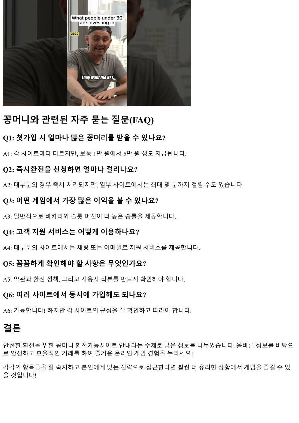 꽁머니와관련된자주묻는질문(FAQ) Q1: 첫가입시얼마나많은꽁머리를받을수있나요? A1: 각사이트마다다르지만, 보통 1만원에서 5만원정도지급됩니다. Q2: 즉시환전을신청하면얼마나걸리나요? A2: 대부분의경우즉시처리되지만, 일부사이트에서는최대몇분까지걸릴수도있습니다. Q3: 어떤게임에서가장많은이익을볼수있나요? A3: 일반적으로바카라와슬롯머신이더높은승률을제공합니다. Q4: 고객지원서비스는어떻게이용하나요? A4: 대부분의사이트에서는채팅또는이메일로지원서비스를제공합니다. Q5: 꼼꼼하게확인해야할사항은무엇인가요? A5: 약관과환전정책, 그리고사용자리뷰를반드시확인해야합니다. Q6: 여러사이트에서동시에가입해도되나요? A6: 가능합니다! 하지만각사이트의규정을잘확인하고따라야합니다. 결론 안전한환전을위한꽁머니환전가능사이트안내라는주제로많은정보를나누었습니다. 올바른정보를바탕으 로안전하고효율적인거래를하여즐거운온라인게임경험을누리세요! 각각의항목들을잘숙지하고본인에게맞는전략으로접근한다면훨씬더유리한상황에서게임을즐길수있 을것입니다!