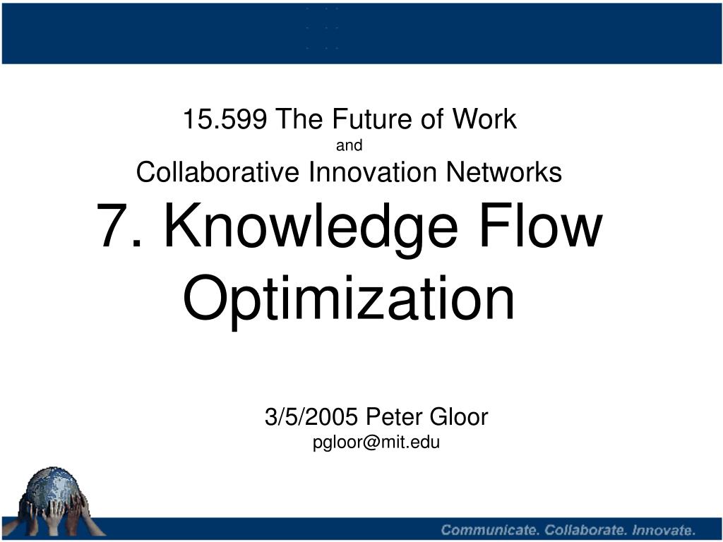 15.599 The Future of Work andCollaborative Innovation Networks7. Knowledge Flow Optimization 3/5/2005 Peter Gloor pgloor@mit.edu