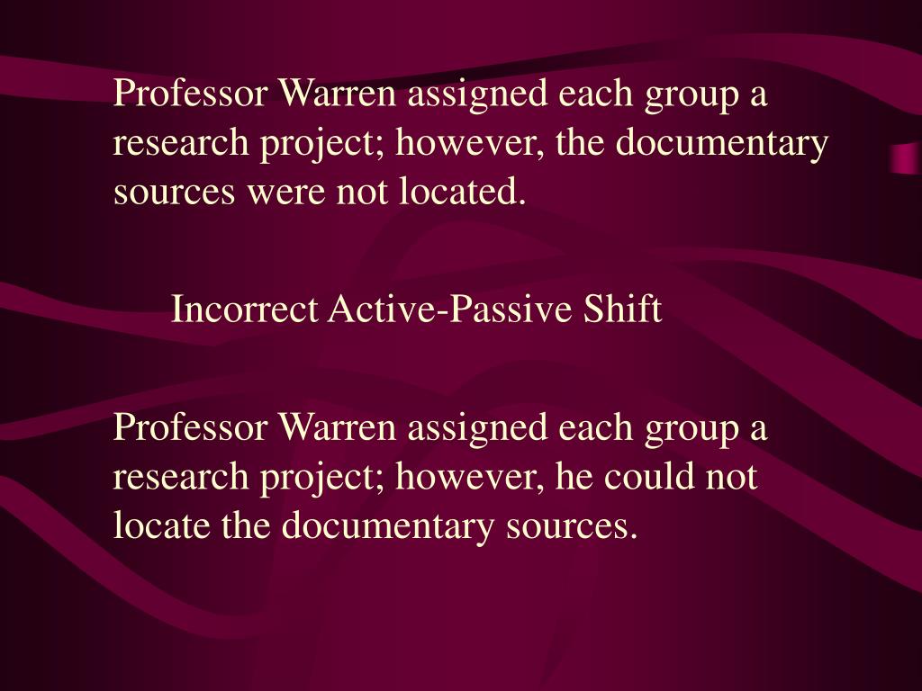 Professor Warren assigned each group a research project; however, the documentary sources were not located. Incorrect Active-Passive Shift Professor Warren assigned each group a research project; however, he could not locate the documentary sources.
