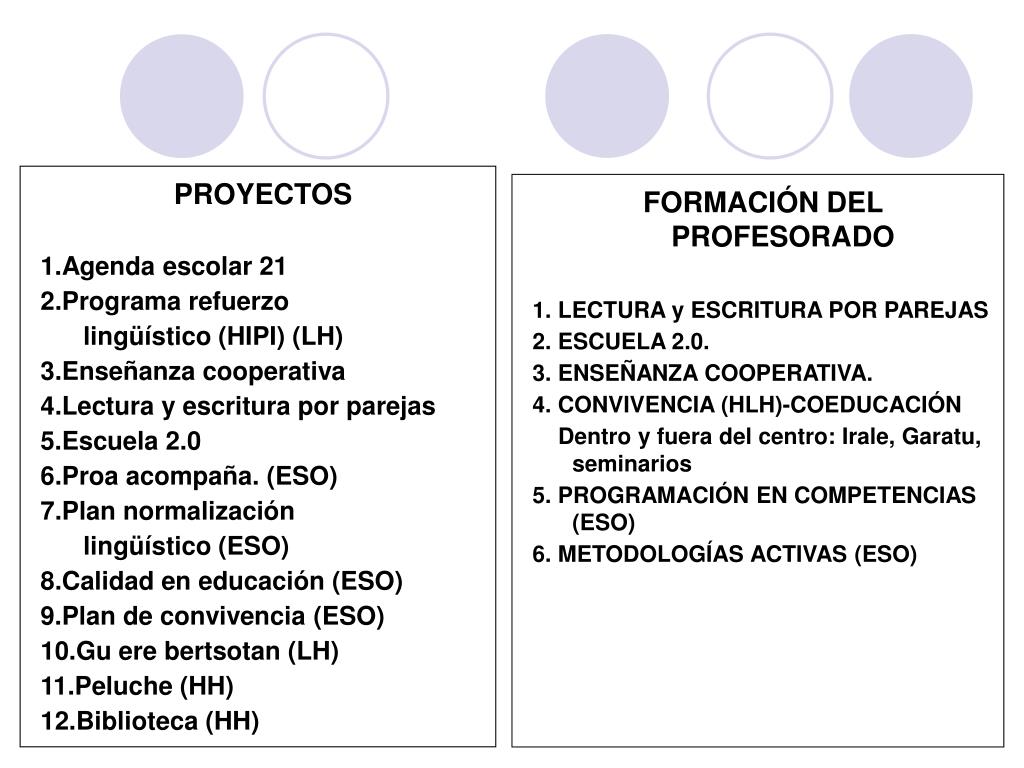 PROYECTOS 1.Agenda escolar 21 2.Programa refuerzo lingüístico (HIPI) (LH) 3.Enseñanza cooperativa 4.Lectura y escritura por parejas 5.Escuela 2.0 6.Proa acompaña. (ESO) 7.Plan normalización lingüístico (ESO) 8.Calidad en educación (ESO) 9.Plan de convivencia (ESO) 10.Gu ere bertsotan (LH) 11.Peluche (HH) 12.Biblioteca (HH) FORMACIÓN DEL PROFESORADO 1. LECTURA y ESCRITURA POR PAREJAS 2. ESCUELA 2.0. 3. ENSEÑANZA COOPERATIVA. 4. CONVIVENCIA (HLH)-COEDUCACIÓN Dentro y fuera del centro: Irale, Garatu, seminarios 5. PROGRAMACIÓN EN COMPETENCIAS (ESO) 6. METODOLOGÍAS ACTIVAS (ESO)