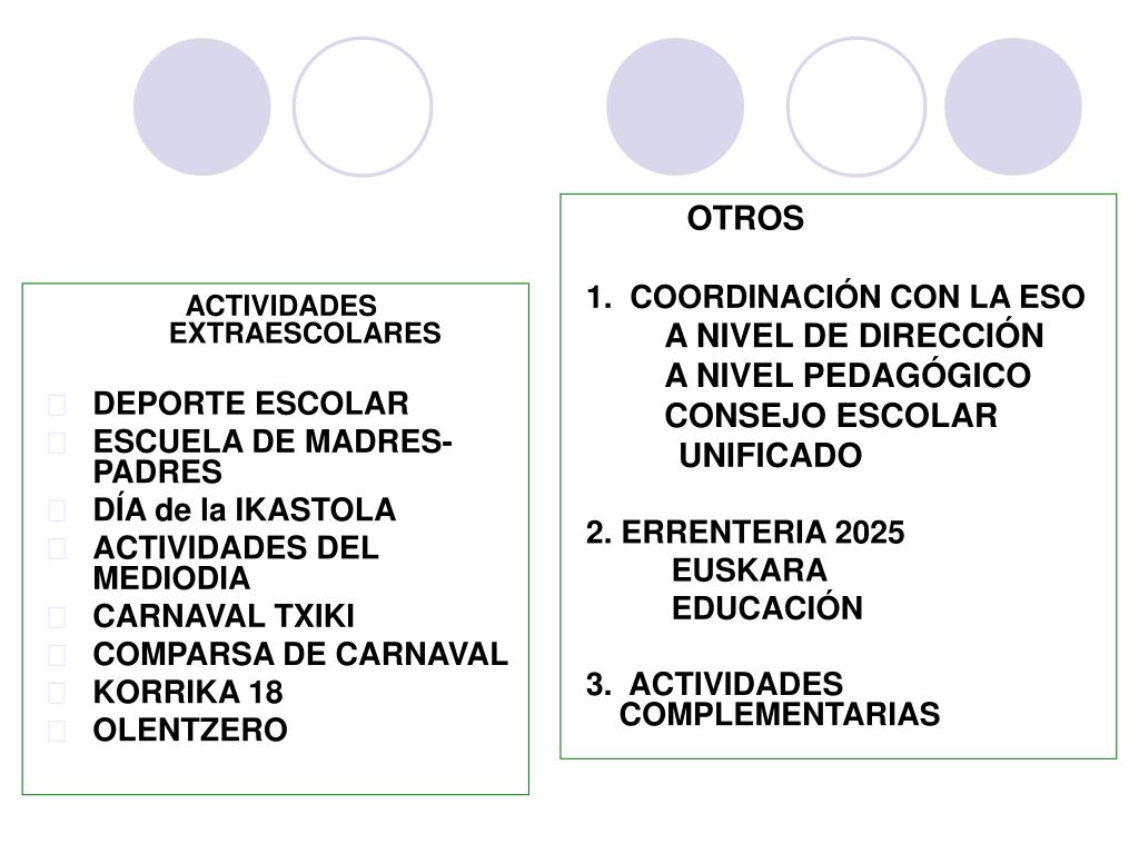 OTROS 1. COORDINACIÓN CON LA ESO A NIVEL DE DIRECCIÓN A NIVEL PEDAGÓGICO CONSEJO ESCOLAR UNIFICADO 2. ERRENTERIA 2025 EUSKARA EDUCACIÓN 3. ACTIVIDADES COMPLEMENTARIAS ACTIVIDADES EXTRAESCOLARES • DEPORTE ESCOLAR • ESCUELA DE MADRES-PADRES • DÍA de la IKASTOLA • ACTIVIDADES DEL MEDIODIA • CARNAVAL TXIKI • COMPARSA DE CARNAVAL • KORRIKA 18 • OLENTZERO