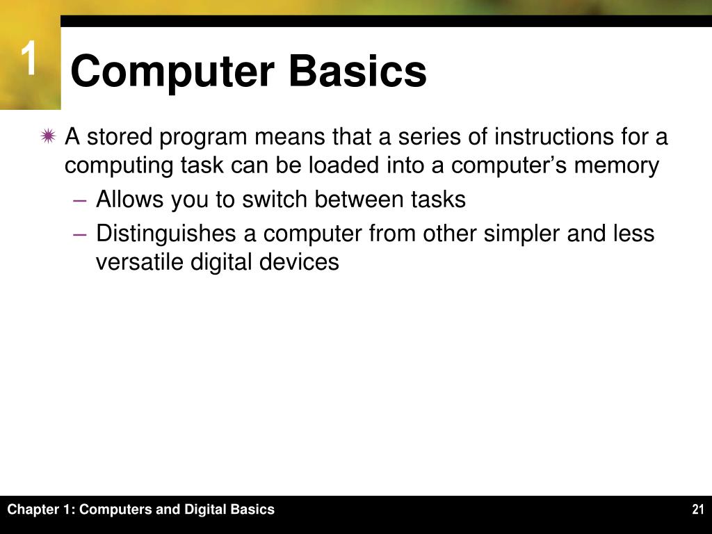 Computer Basics • A stored program means that a series of instructions for a computing task can be loaded into a computer’s memory • Allows you to switch between tasks • Distinguishes a computer from other simpler and less versatile digital devices Chapter 1: Computers and Digital Basics
