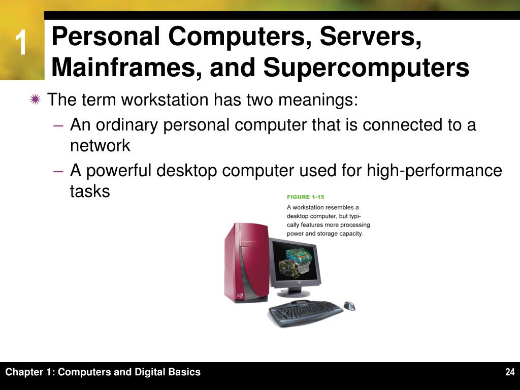 Personal Computers, Servers, Mainframes, and Supercomputers • The term workstation has two meanings: • An ordinary personal computer that is connected to a network • A powerful desktop computer used for high-performance tasks Chapter 1: Computers and Digital Basics