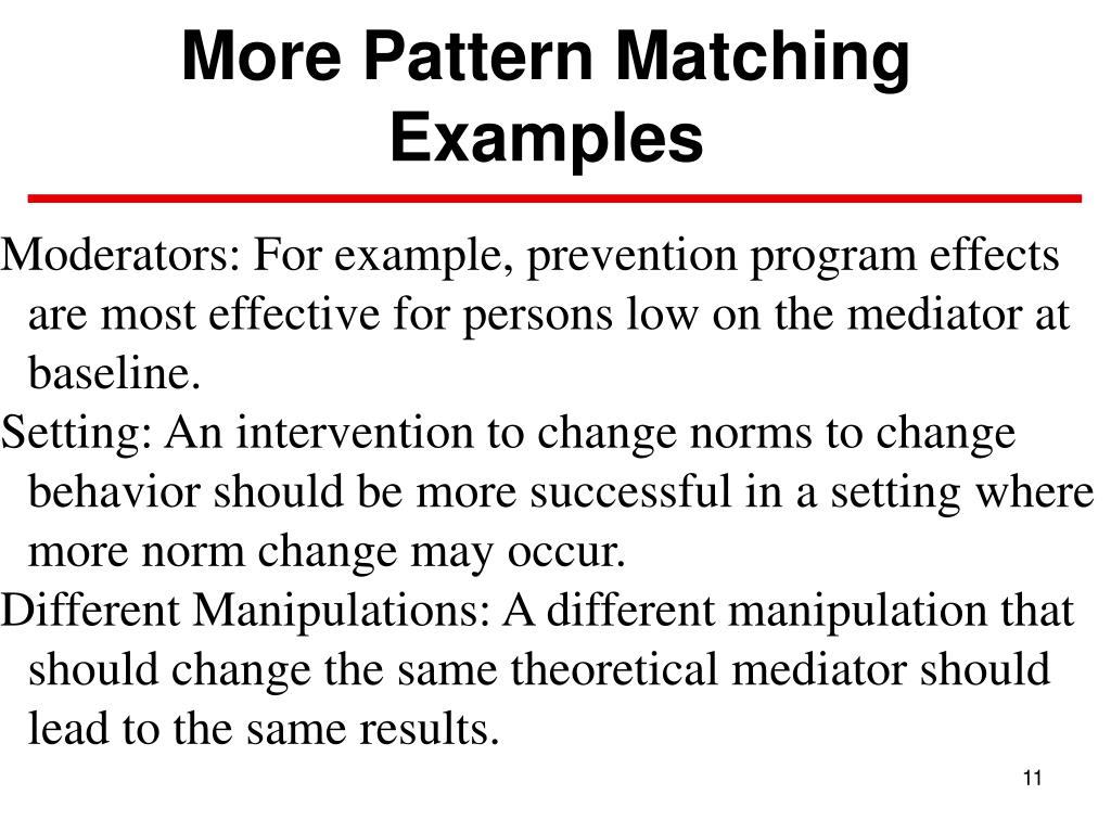 More Pattern Matching Examples Moderators: For example, prevention program effects are most effective for persons low on the mediator at baseline. Setting: An intervention to change norms to change behavior should be more successful in a setting where more norm change may occur. Different Manipulations: A different manipulation that should change the same theoretical mediator should lead to the same results.