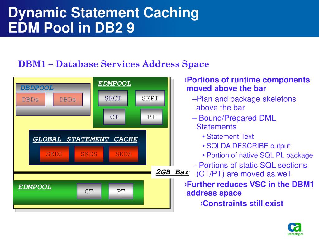Dynamic Statement Caching EDM Pool in DB2 9 DBM1 – Database Services Address Space • Portions of runtime components moved above the bar • Plan and package skeletons above the bar • Bound/Prepared DML Statements • Statement Text • SQLDA DESCRIBE output • Portion of native SQL PL package • Portions of static SQL sections (CT/PT) are moved as well • Further reduces VSC in the DBM1 address space • Constraints still exist EDMPOOL DBDPOOL SKCT SKPT DBDs DBDs CT PT GLOBAL STATEMENT CACHE SKDS SKDS SKDS 2GB Bar EDMPOOL CT PT