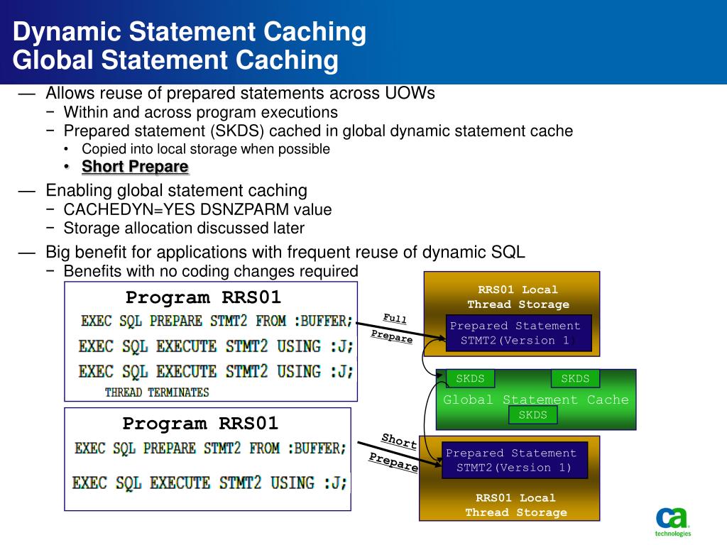 Full Prepare Full Prepare Used Discarded Prepared Statement STMT2(Version 2) Used Dynamic Statement CachingNo Statement Caching • Prepared statements do not persist across commits • Discarded at commit • Except for statements defined with CURSOR for HOLD • Default mode of operation • Full Prepare has a high cost Program RRS01 Thread Storage Prepared Statement STMT2(Version 1) • No prepare returns -514 or -518