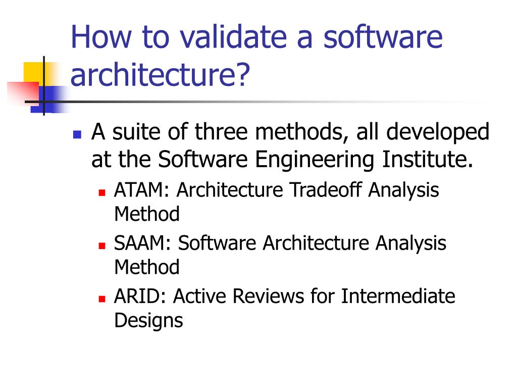 How to validate a software architecture? • A suite of three methods, all developed at the Software Engineering Institute. • ATAM: Architecture Tradeoff Analysis Method • SAAM: Software Architecture Analysis Method • ARID: Active Reviews for Intermediate Designs