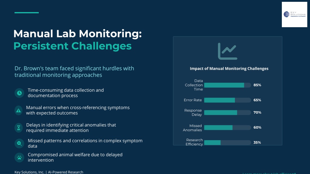 Manual Lab Monitoring: Persistent Challenges Dr. Brown's team faced significant hurdles with traditional monitoring approaches Impact of Manual Monitoring Challenges Data Collection Time 85% Time-consuming data collection and documentation process Error Rate 65% Manual errors when cross-referencing symptoms with expected outcomes Response Delay 70% Delays in identifying critical anomalies that required immediate attention Missed Anomalies 60% Research Efficiency 35% Missed patterns and correlations in complex symptom data Compromised animal welfare due to delayed intervention Key Solutions, Inc. | AI-Powered Research Innovation Learn more about lab efficiency
