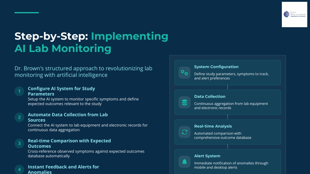 Step-by-Step: Implementing AI Lab Monitoring Dr. Brown's structured approach to revolutionizing lab monitoring with artificial intelligence System Configuration Define study parameters, symptoms to track, and alert preferences 1 Configure AI System for Study Parameters Data Collection Setup the AI system to monitor specific symptoms and define expected outcomes relevant to the study Continuous aggregation from lab equipment and electronic records 2 Automate Data Collection from Lab Sources Connect the AI system to lab equipment and electronic records for continuous data aggregation Real-time Analysis Automated comparison with comprehensive outcome database 3 Real-time Comparison with Expected Outcomes Cross-reference observed symptoms against expected outcomes database automatically Alert System Immediate notification of anomalies through mobile and desktop alerts 4 Instant Feedback and Alerts for Anomalies Receive immediate notifications when deviations occur, enabling prompt intervention Reporting & Insights Comprehensive data visualization and pattern recognition reports 5 Generate Actionable Reports and Insights Produce comprehensive "cheat sheets" and pattern analysis for research optimization Key Solutions, Inc. | AI-Powered Research Innovation Explore AI workflow solutions