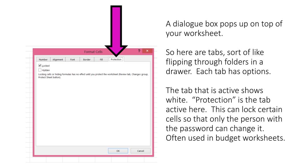 A dialogue box pops up on top of your worksheet.So here are tabs, sort of like flipping through folders in a drawer. Each tab has options.The tab that is active shows white. “Protection” is the tab active here. This can lock certain cells so that only the person with the password can change it. Often used in budget worksheets.