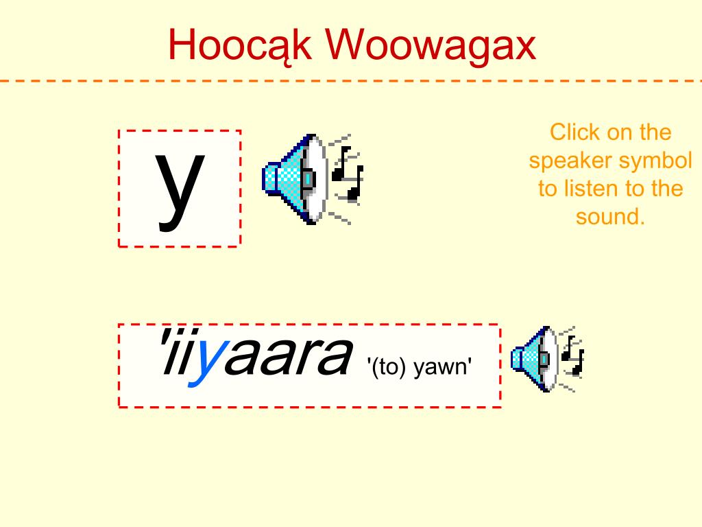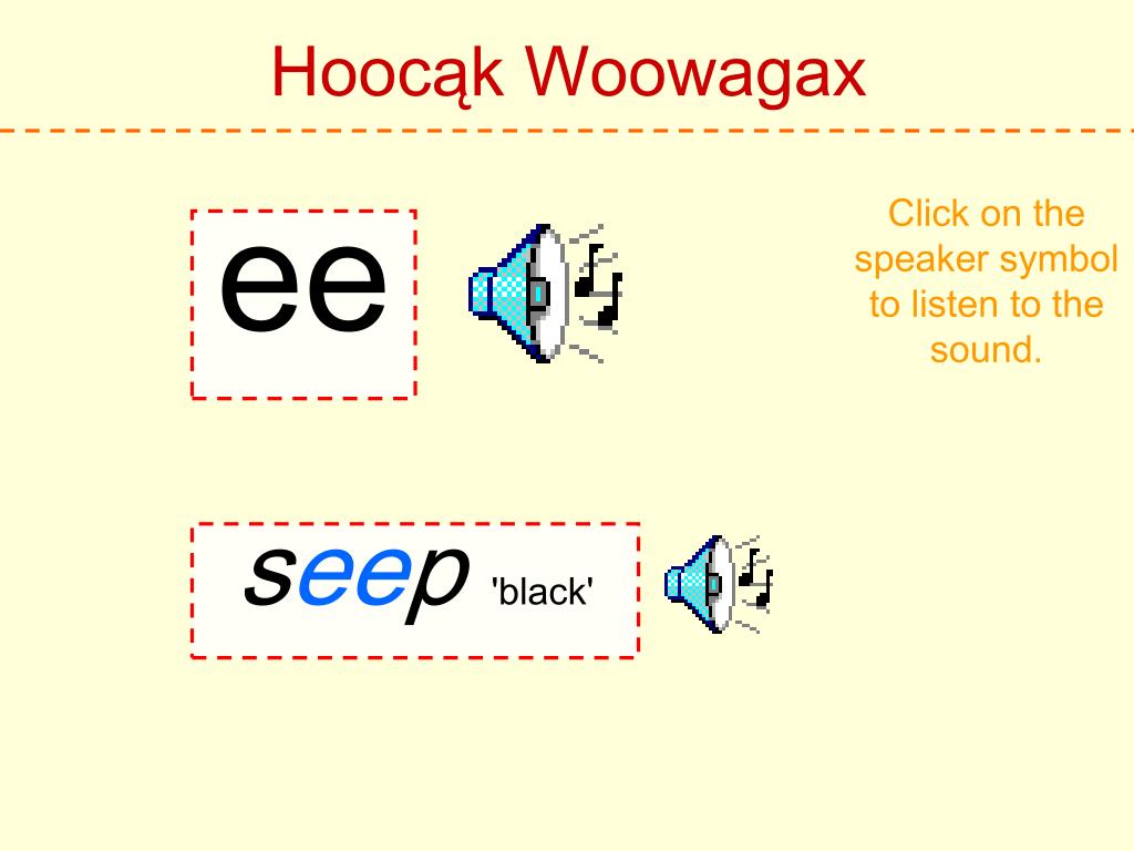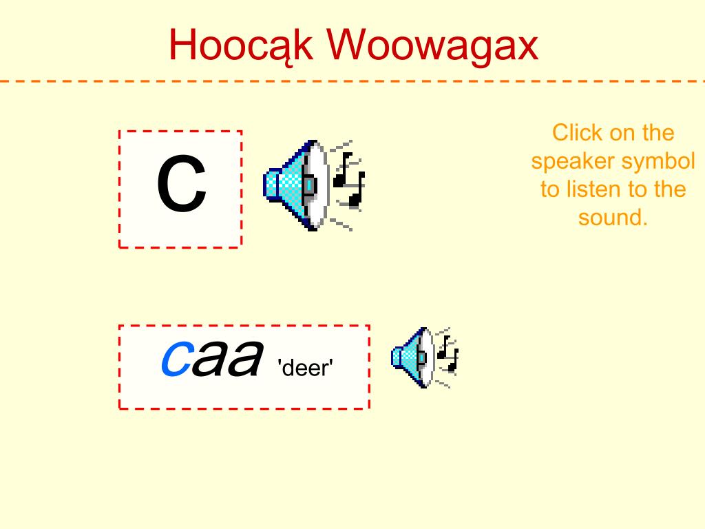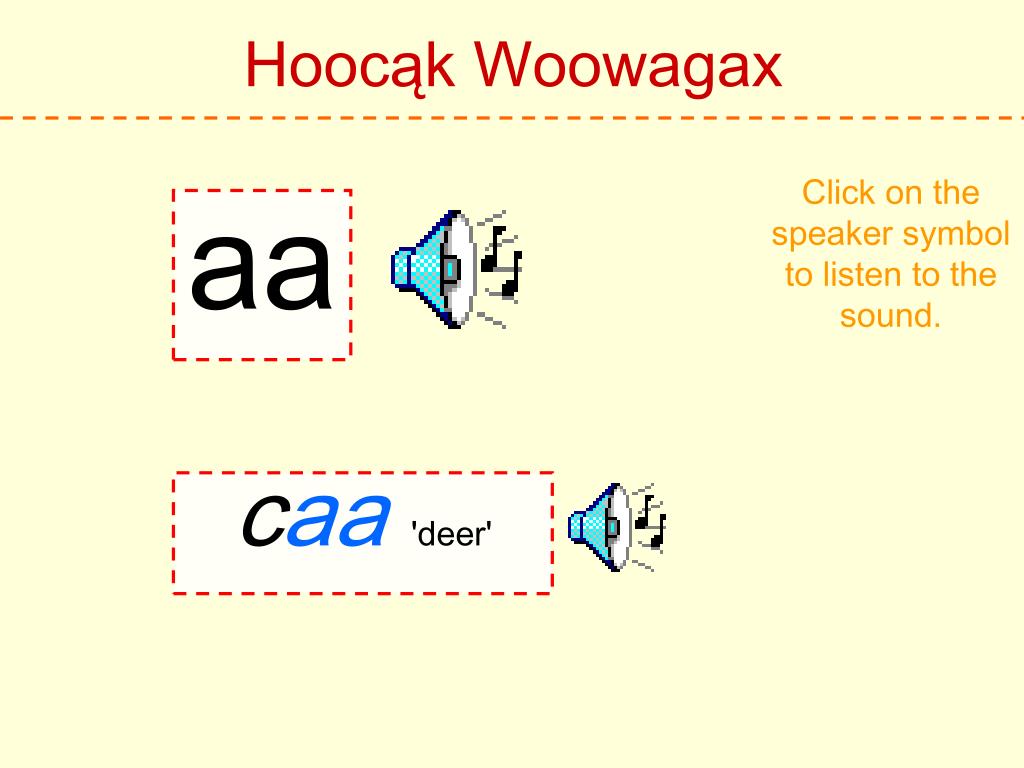 Hoocąk Woowagax Click on the speaker symbol to listen to the sound. aa caa'deer'