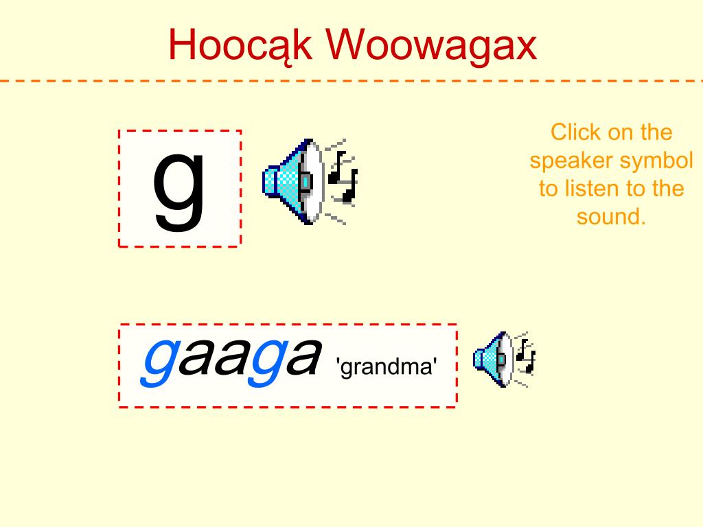 Hoocąk Woowagax Click on the speaker symbol to listen to the sound. g gaaga 'grandma'