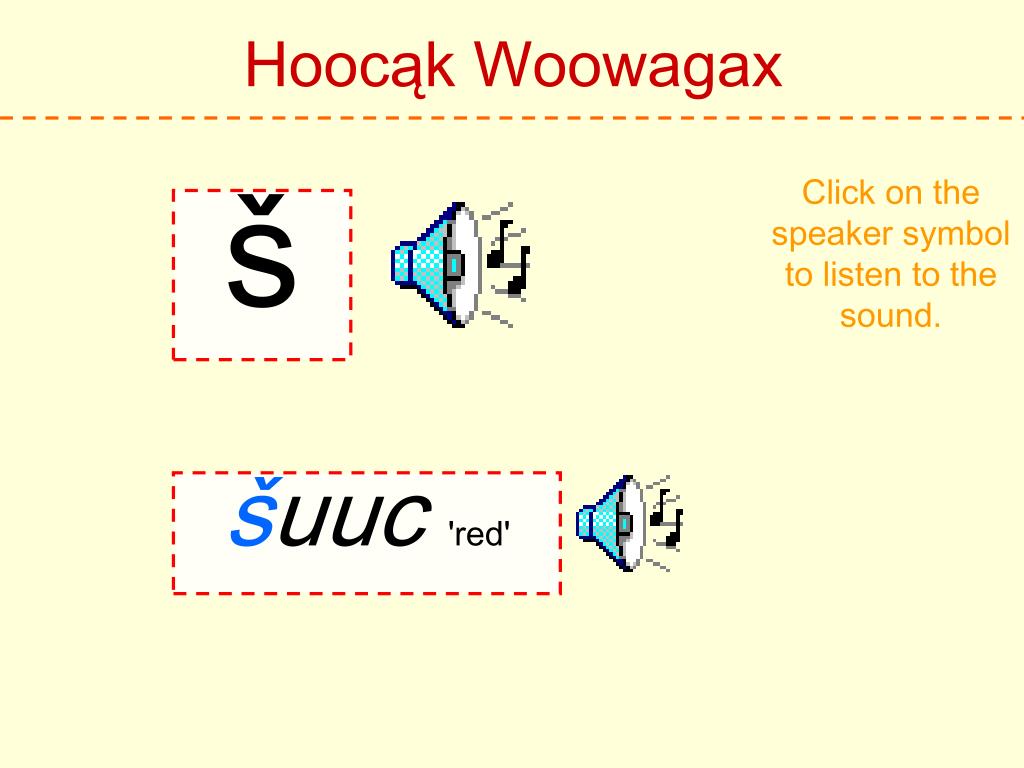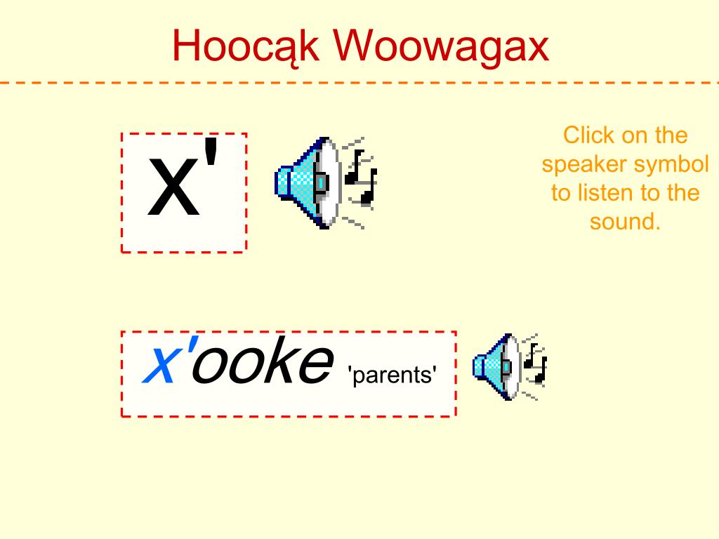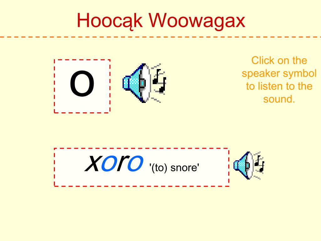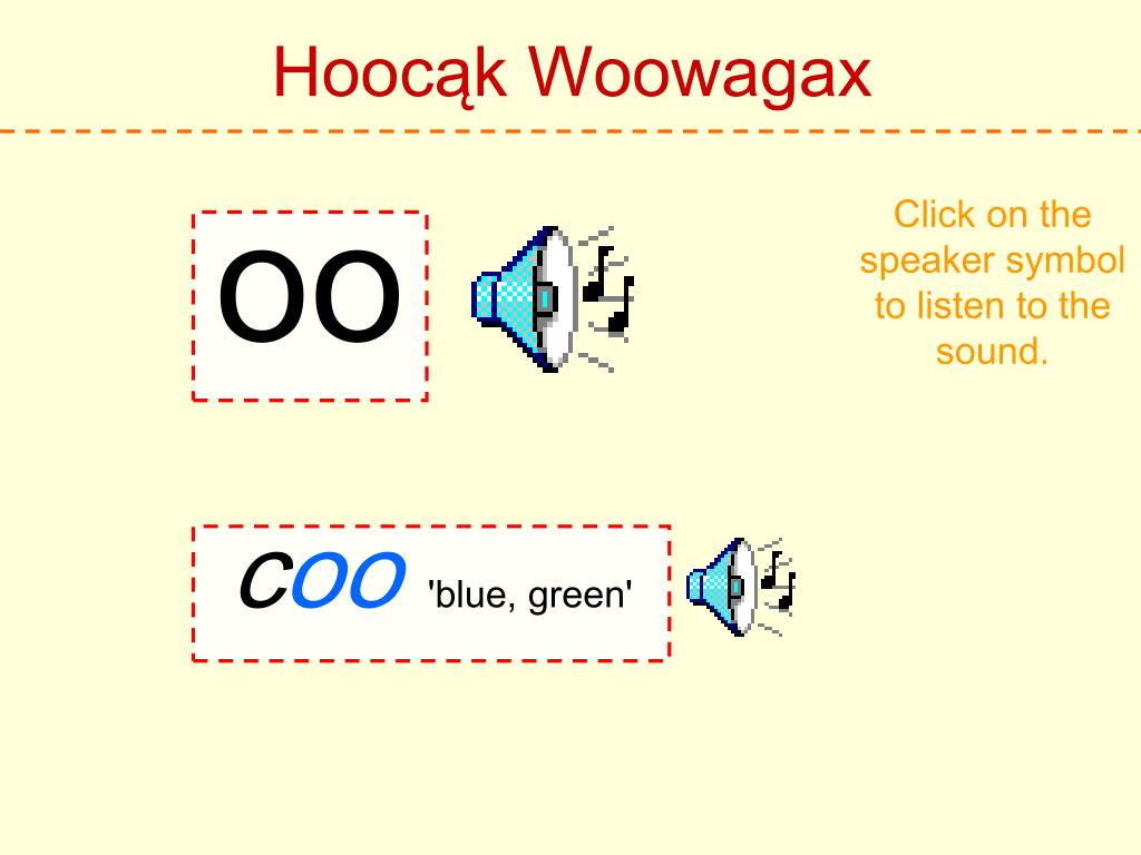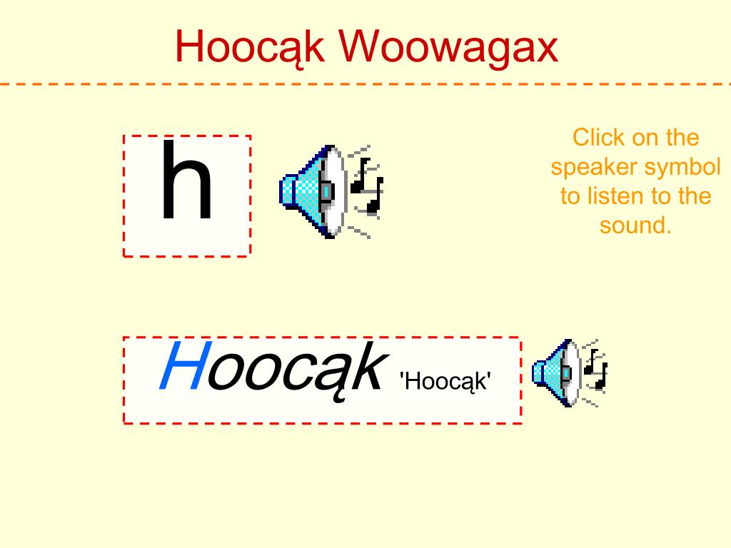 Hoocąk Woowagax Click on the speaker symbol to listen to the sound. h Hoocąk 'Hoocąk'