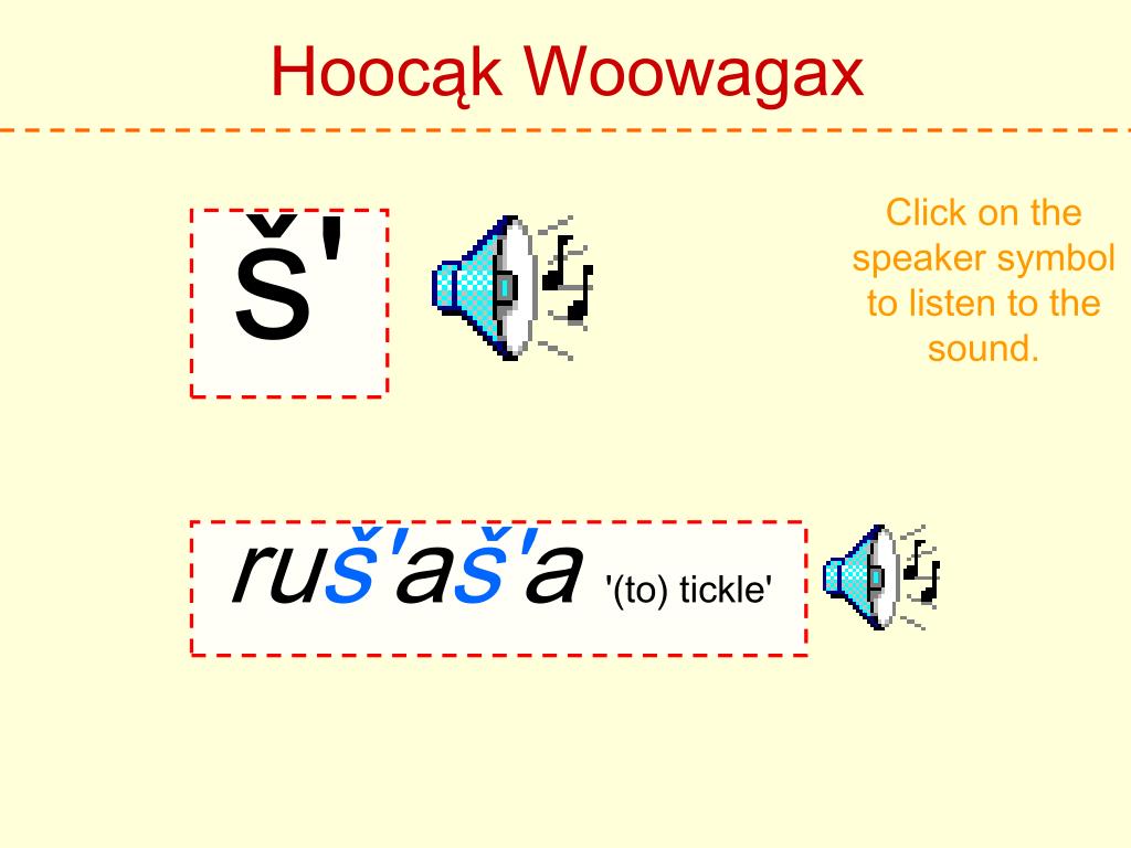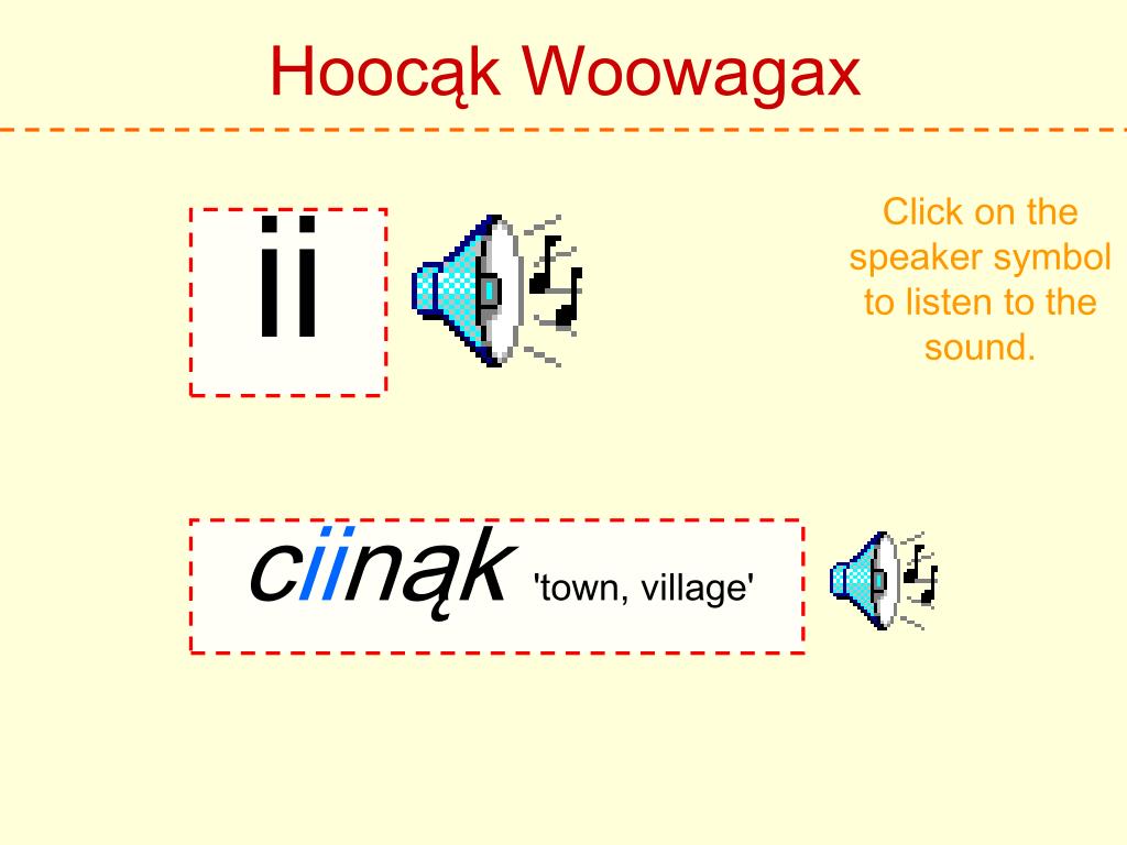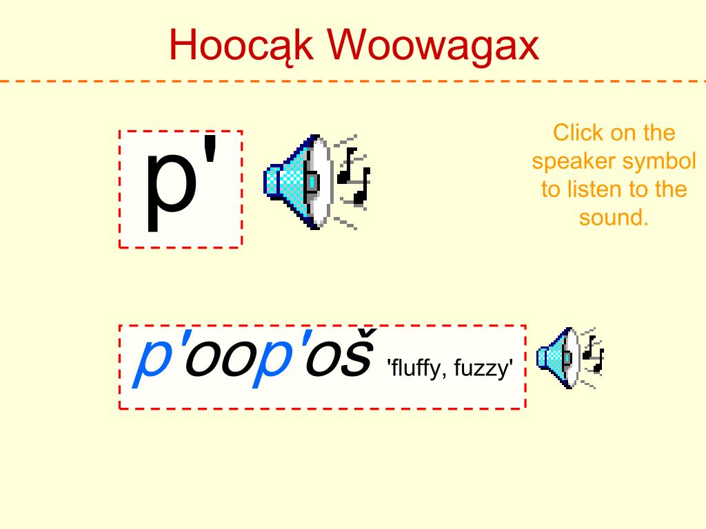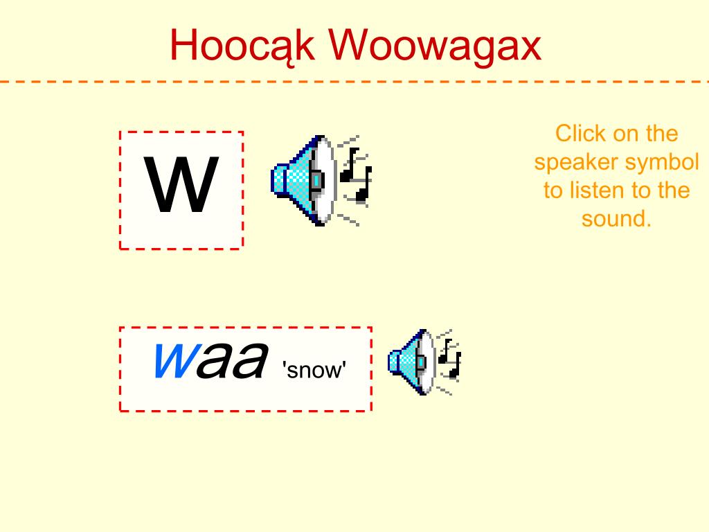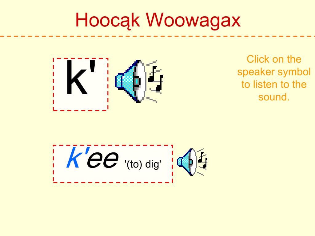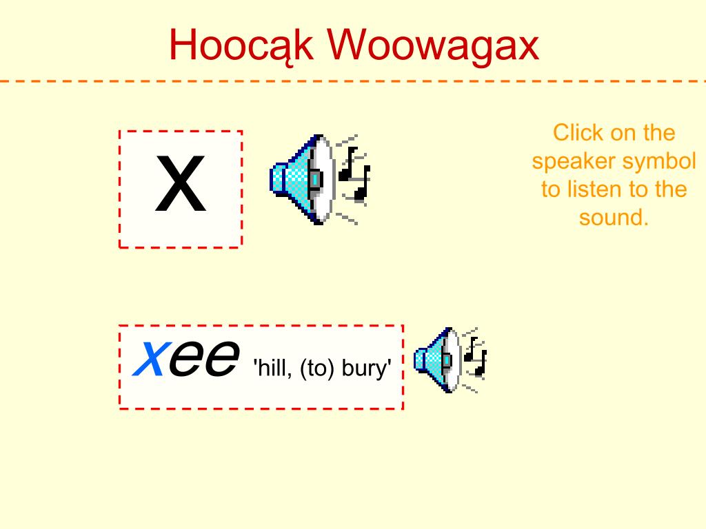 Hoocąk Woowagax Click on the speaker symbol to listen to the sound. h Hoocąk 'Hoocąk'
