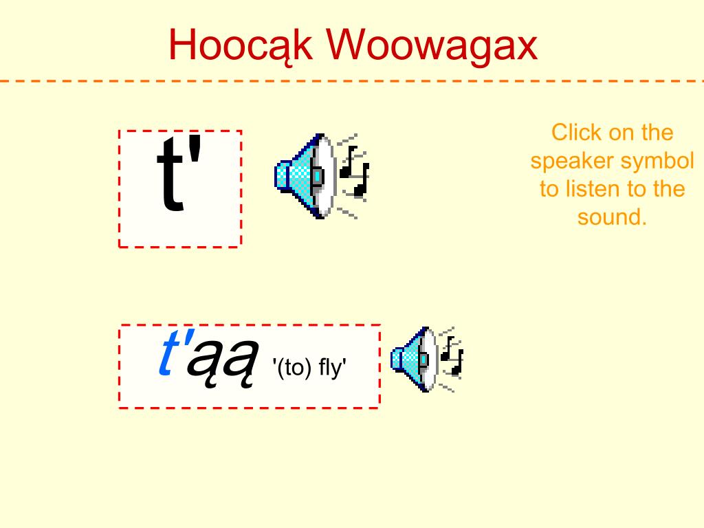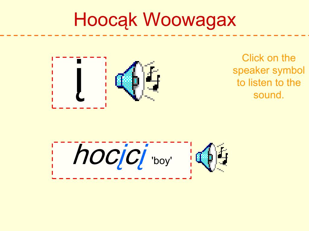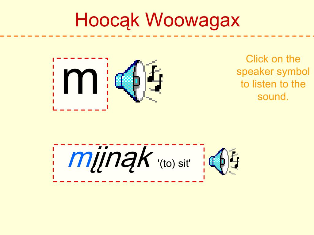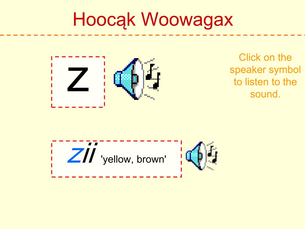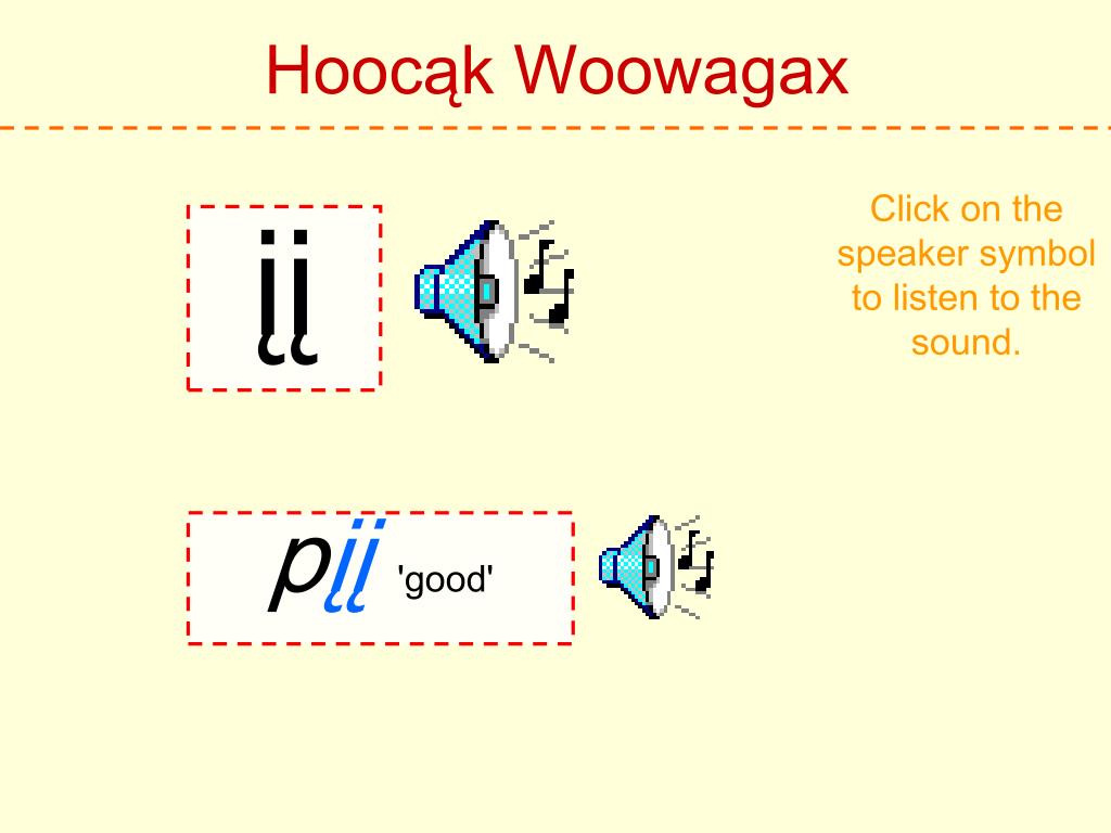 Hoocąk Woowagax Click on the speaker symbol to listen to the sound. h Hoocąk 'Hoocąk'