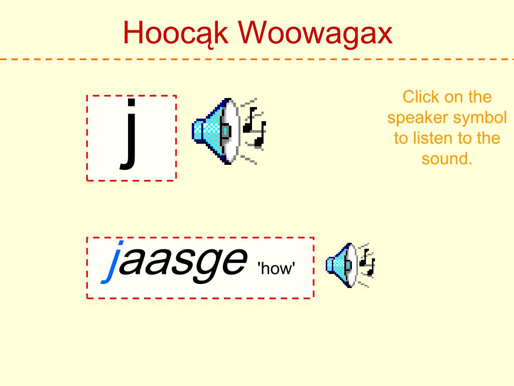 Hoocąk Woowagax Click on the speaker symbol to listen to the sound. j jaasge 'how'
