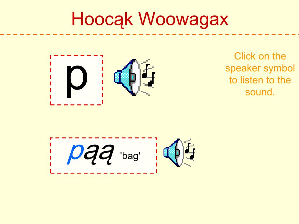 Hoocąk Woowagax Click on the speaker symbol to listen to the sound. ą pąą'bag'