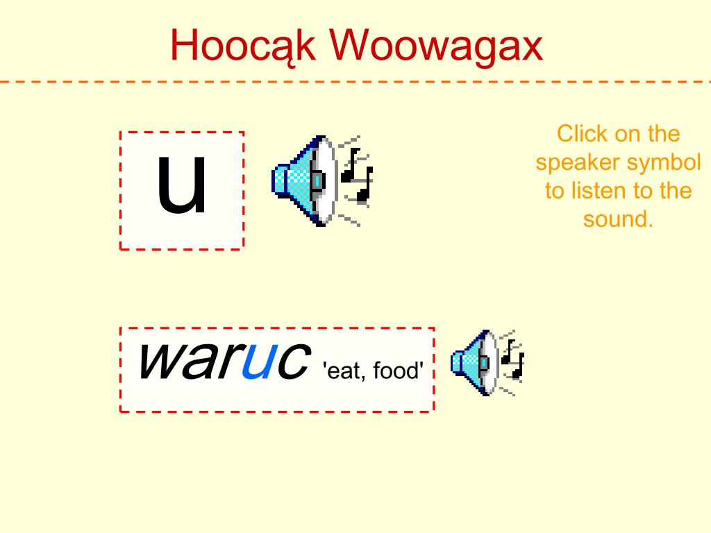 Hoocąk Woowagax Click on the speaker symbol to listen to the sound. uu huu'leg'