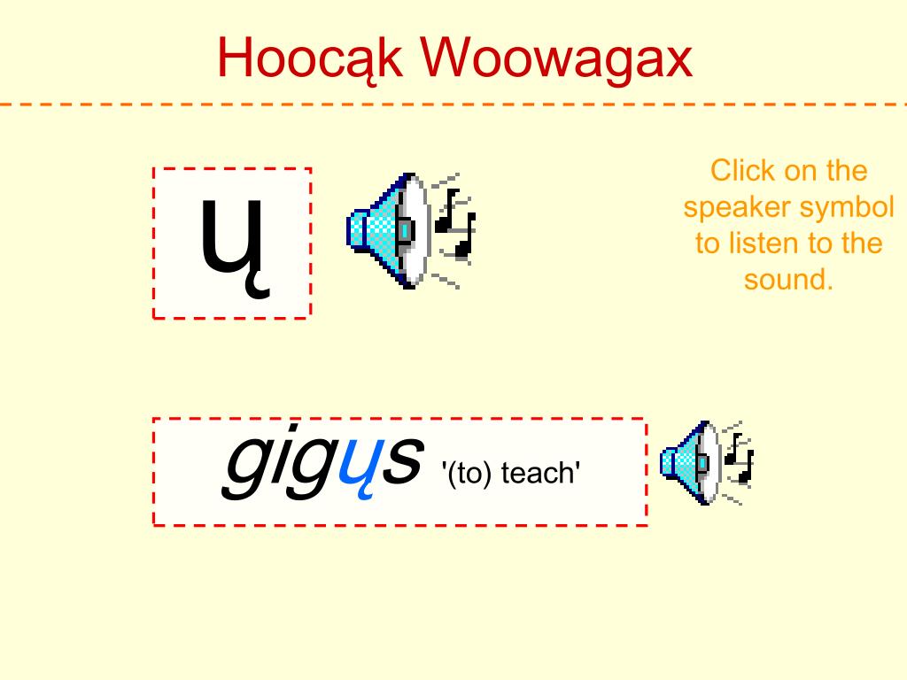 Hoocąk Woowagax Click on the speaker symbol to listen to the sound. ų gigųs '(to) teach'