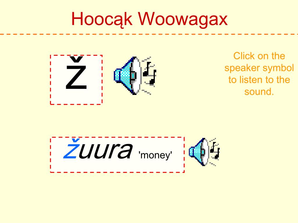 Hoocąk Woowagax Click on the speaker symbol to listen to the sound. ž žuura 'money'