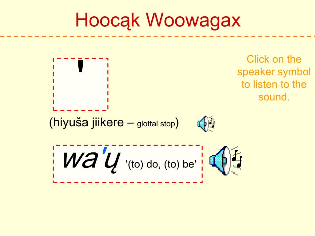 Hoocąk Woowagax Click on the speaker symbol to listen to the sound. ' (hiyuša jiikere – glottal stop) wa'ų '(to) do, (to) be'