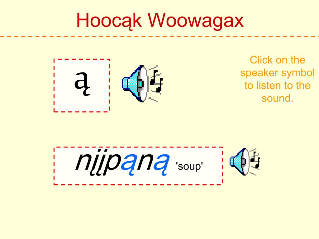 Hoocąk Woowagax Click on the speaker symbol to listen to the sound. ą nįįpąną'soup'