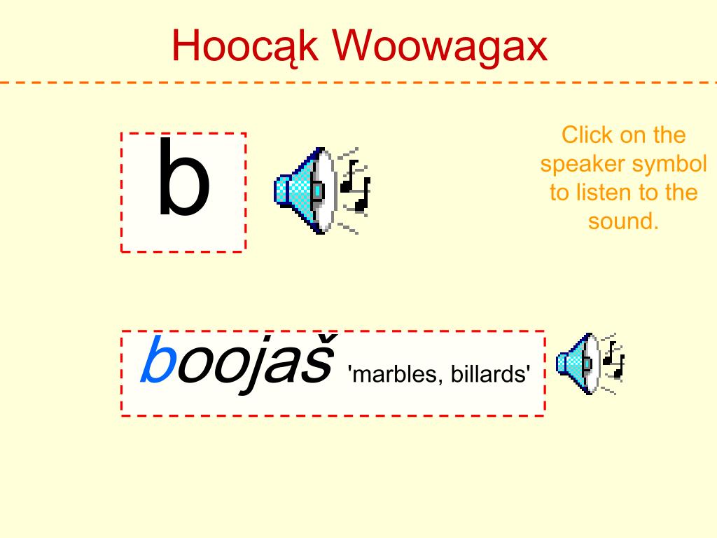Hoocąk Woowagax Click on the speaker symbol to listen to the sound. b boojaš 'marbles, billards'