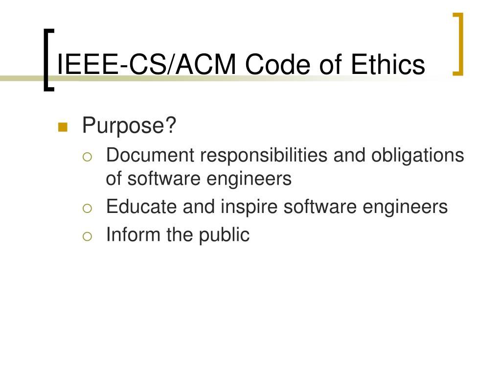IEEE-CS/ACM Code of Ethics • Purpose? • Document responsibilities and obligations of software engineers • Educate and inspire software engineers • Inform the public