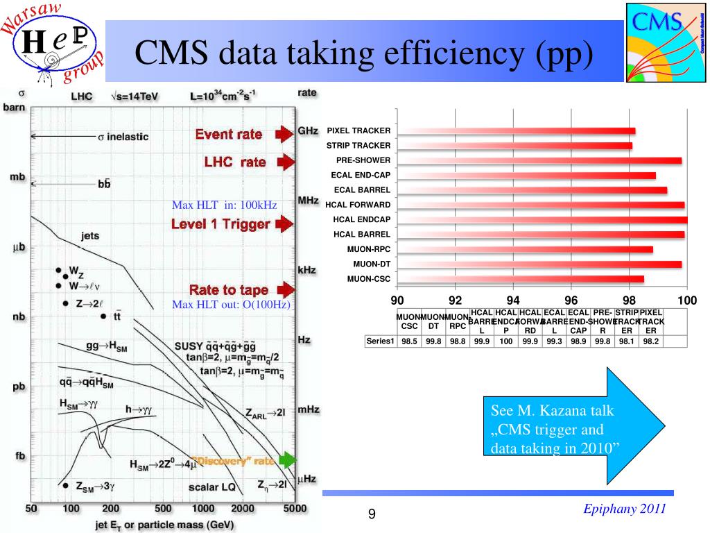 Epiphany 2011 CMS data taking efficiency (pp) Max HLT in: 100kHz Max HLT out: O(100Hz) See M. Kazana talk „CMS trigger and data taking in 2010”