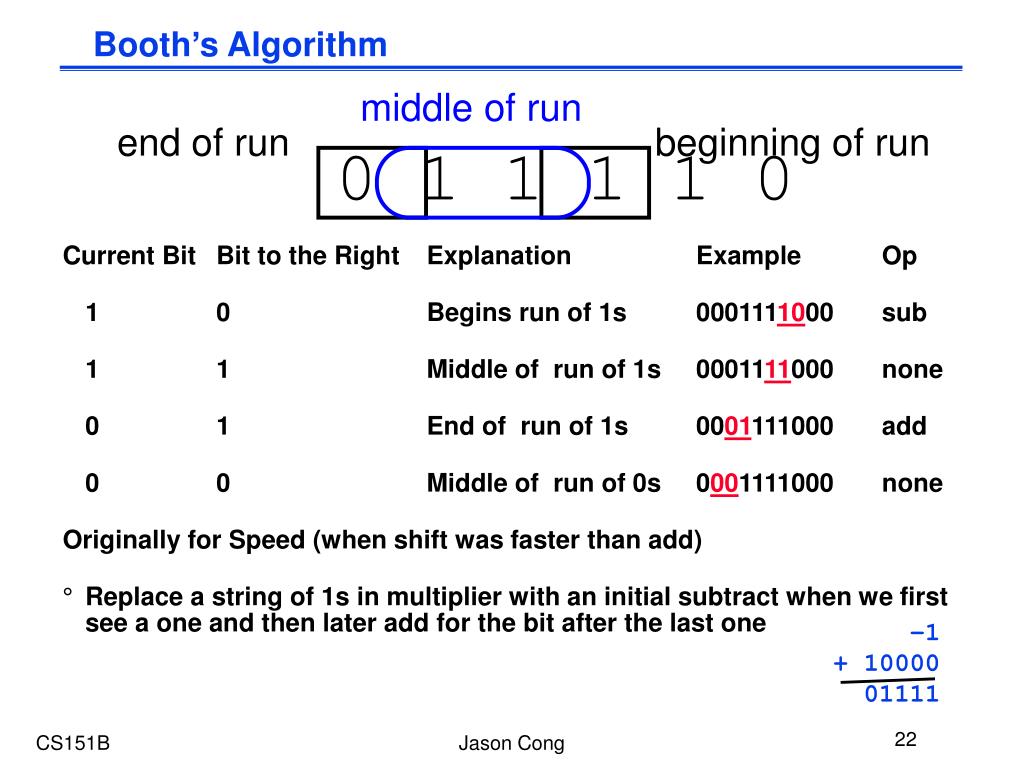 –1 + 10000 01111 Booth’s Algorithm middle of run end of run beginning of run 0 1 1 1 1 0 Current Bit Bit to the Right Explanation Example Op 1 0 Begins run of 1s 0001111000 sub 1 1 Middle of run of 1s 0001111000 none 0 1 End of run of 1s 0001111000 add 0 0 Middle of run of 0s 0001111000 none Originally for Speed (when shift was faster than add) • Replace a string of 1s in multiplier with an initial subtract when we first see a one and then later add for the bit after the last one Jason Cong