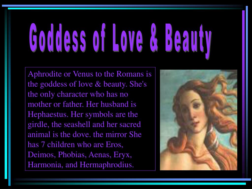 Goddess of Love & Beauty Aphrodite or Venus to the Romans is the goddess of love & beauty. She's the only character who has no mother or father. Her husband is Hephaestus. Her symbols are the girdle, the seashell and her sacred animal is the dove. the mirror She has 7 children who are Eros, Deimos, Phobias, Aenas, Eryx, Harmonia, and Hermaphrodius.
