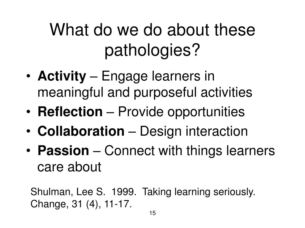 Pedago-pathologies Amnesia Fantasia Inertia Lee Shulman – MSU Med School – PBL Approach (late 60s – early 70s), President Emeritus of the Carnegie Foundation for the Advancement of College Teaching Shulman, Lee S. 1999. Taking learning seriously. Change, 31 (4), 11-17.